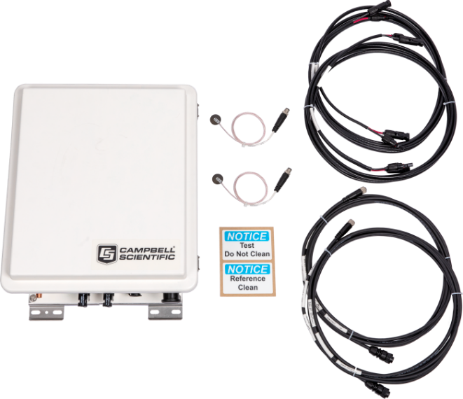 Campbell Scientific’s, The DustVue calculates soiling loss by comparing the effective irradiance from a test PV module—left to soil at a natural rate—to that of a clean reference PV module. Effective irradiance of each module is calculated in accordance with IEC 60904 by using the measured short-circuit current and back-of-module temperature to calculate effective irradiance. The effective irradiance is then used to determine the real-time soiling ratio. Daily values for the soiling-loss index are also calculated and reported, along with a quality factor for quality control purposes